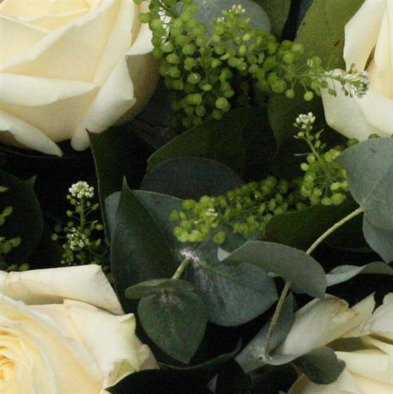 An elegant and stylish bouquet of 12 white roses mixed with a variety of contemporary foliage.