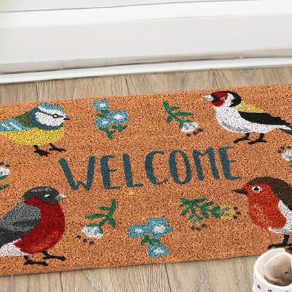 Welcome guests of all varieties with this charming coir doormat. Features classic 'Welcome' text and adorable illustrations of common British garden birds; a Blue Tit, Robin, Goldfinch and Bullfinch. Perfect for covered porches and back garden entrances. Please note that the printed design may fade when left outside in extreme weather